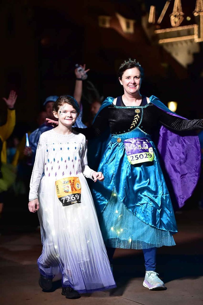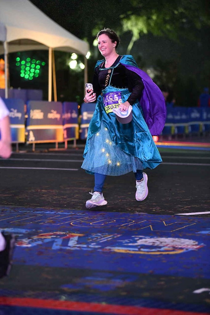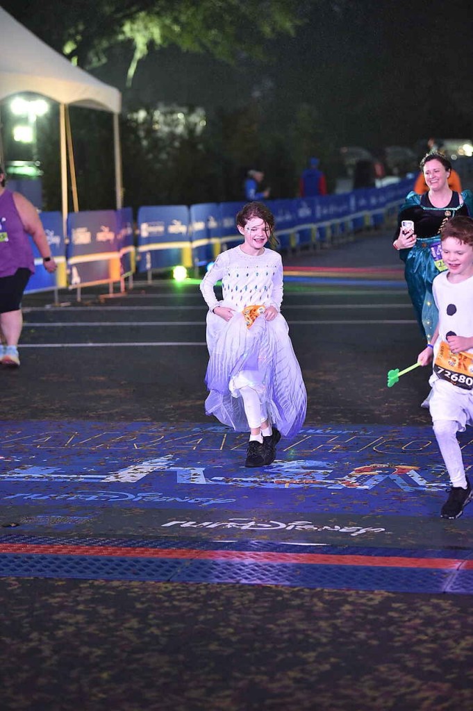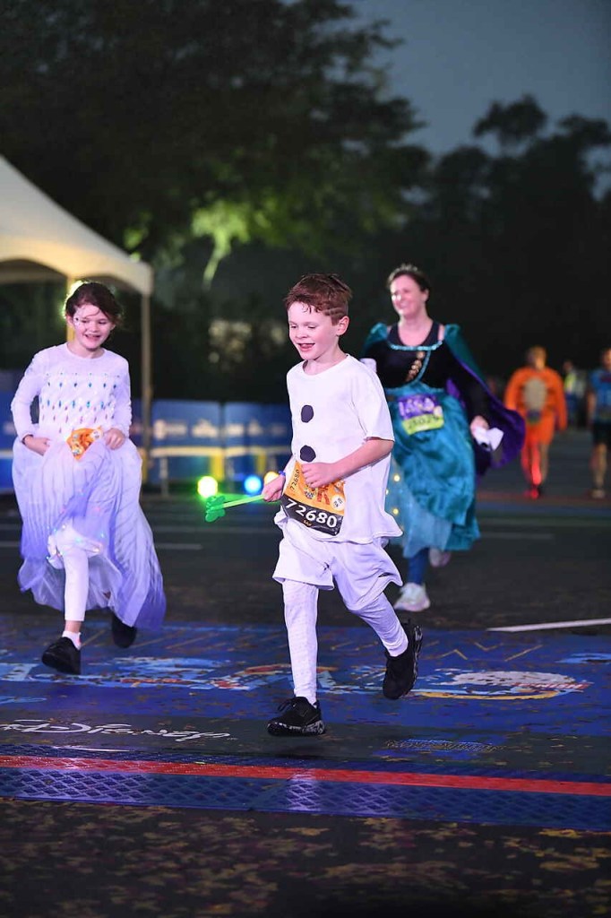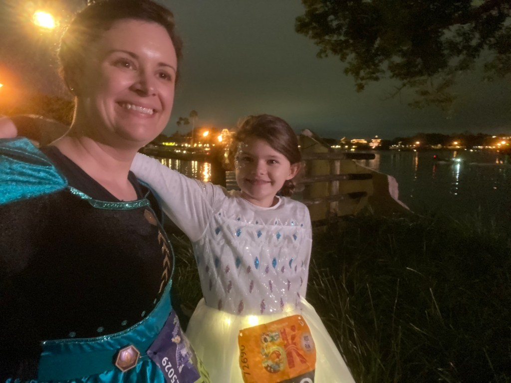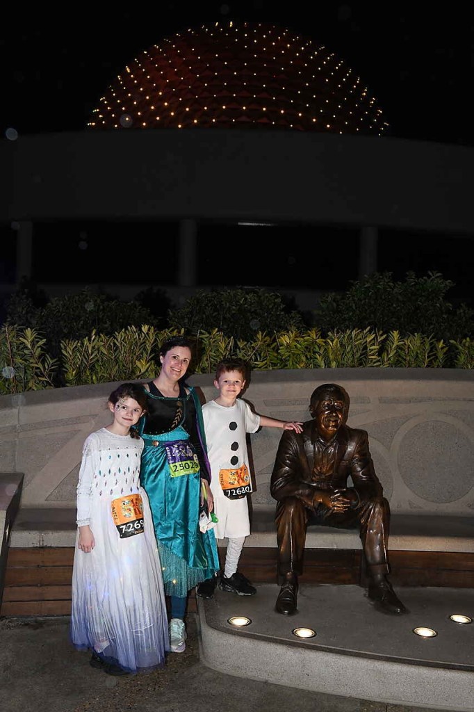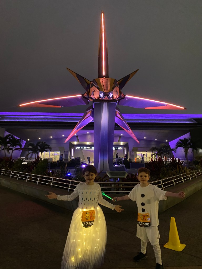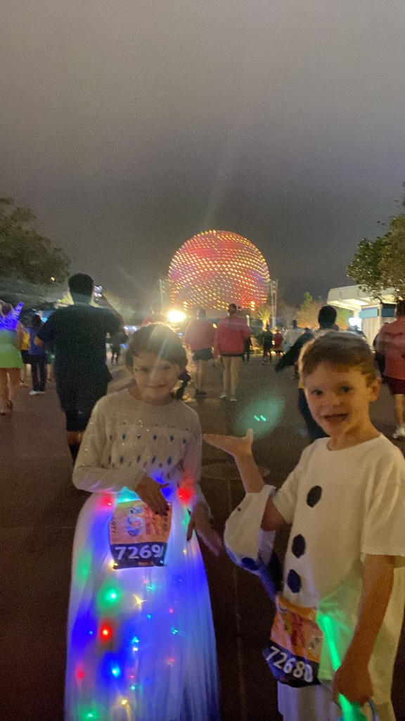 We started the race strong and ran to Epcot doing the run, walk, run method (using light posts as markers), and while in Epcot we took our time and enjoyed the sights running around the world, getting pictures with characters, talking with other runners, and of course, enjoying the Epcot Ball in all its nighttime glory! And since my son picked the theme of Olaf, Queen Anna, and Spirit Elsa, we went all out and I decided to add lights to our dresses! Sadly, we left his Olaf hat at home, but don’t worry I will show it off in the post about how we tailored these to make them our own! This to us represented overcoming challenges, like endurance training and cold and “finally finding summer”. For me the Anna costume represented taking a leadership role, maybe not one ever thought would be mine (like Anna), and taking kids on a journey of what heatlhy relationship with running looks like.