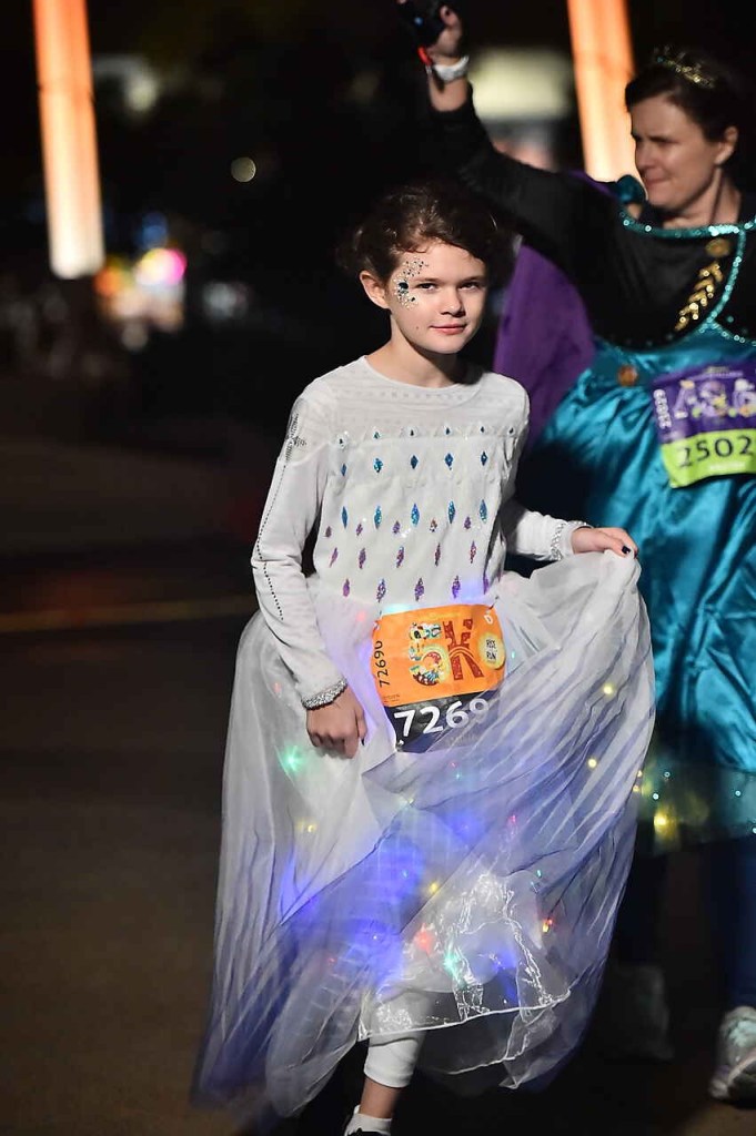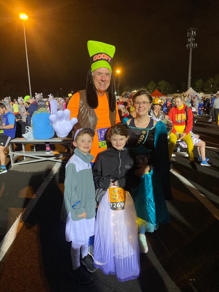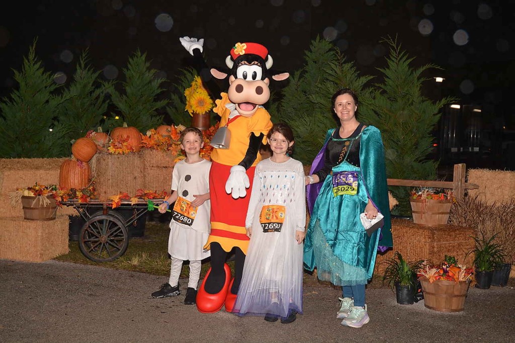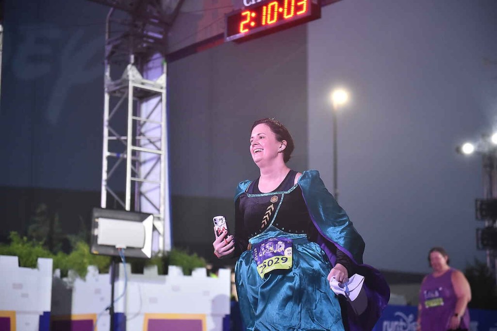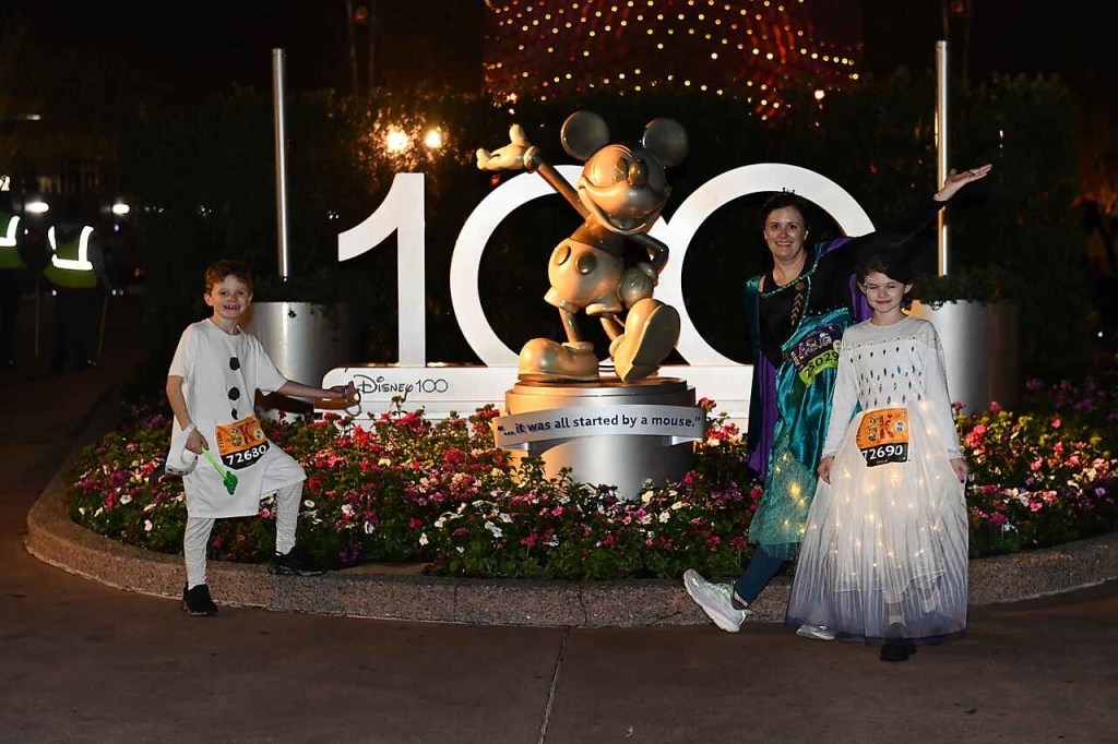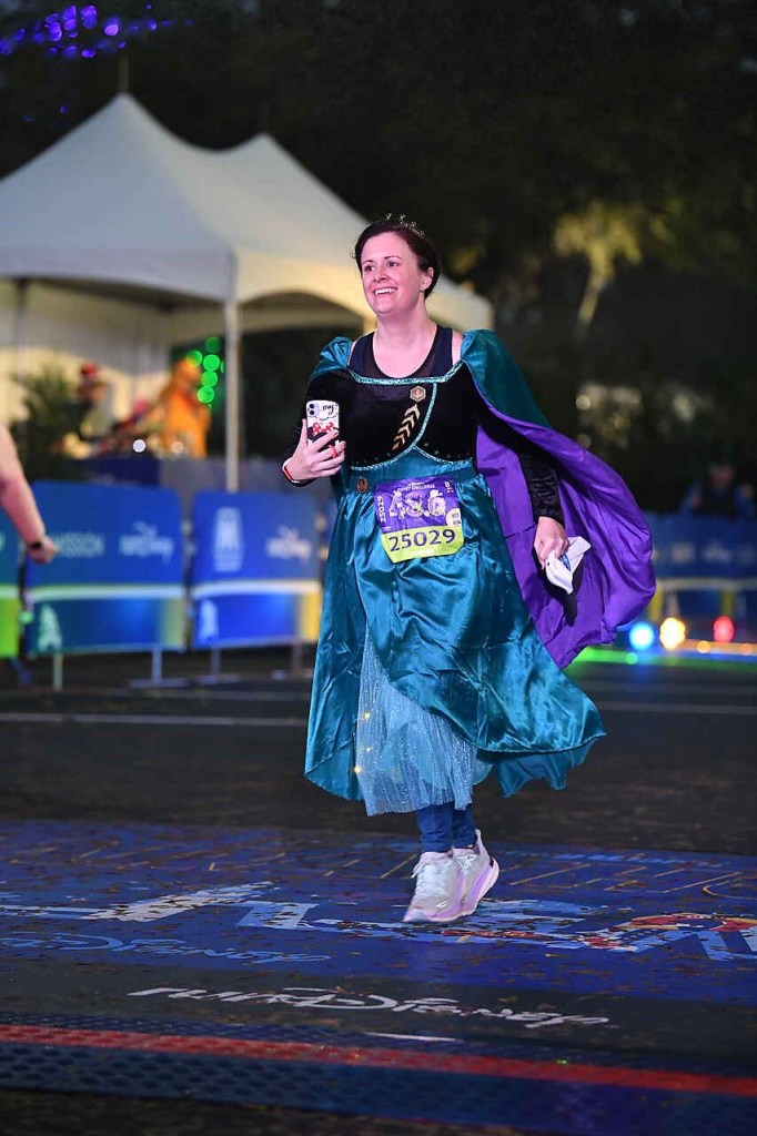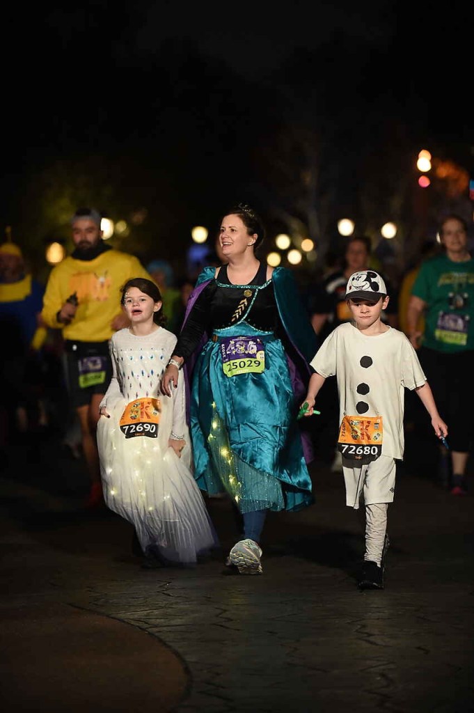 We started the race strong and ran to Epcot doing the run, walk, run method (using light posts as markers), and while in Epcot we took our time and enjoyed the sights running around the world, getting pictures with characters, talking with other runners, and of course, enjoying the Epcot Ball in all its nighttime glory! And since my son picked the theme of Olaf, Queen Anna, and Spirit Elsa, we went all out and I decided to add lights to our dresses! Sadly, we left his Olaf hat at home, but don’t worry I will show it off in the post about how we tailored these to make them our own! This to us represented overcoming challenges, like endurance training and cold and “finally finding summer”. For me the Anna costume represented taking a leadership role, maybe not one ever thought would be mine (like Anna), and taking kids on a journey of what heatlhy relationship with running looks like.